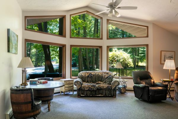 The great room is an excellent place to gather with friends, read a book, play a game, or just enjoy the fireplace and, of course, the views of the lovely trees and animals outside. Another sitting room is located near the foyer.